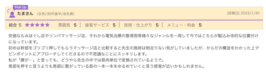 初めは幹部をゴリゴリ押してもらうマッサージ店と比較すると先生の施術は物足りない気がしていましたが、からだの構造をわかった上でピンポイントにアプローチしてくださるので不思議なことにスッキリします。