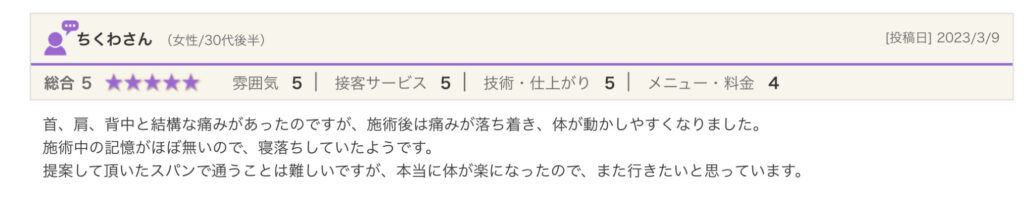 次の日揉み返しで痛みが出ることもなく、痛みが出る前にまた行ってみたいと思いました。
