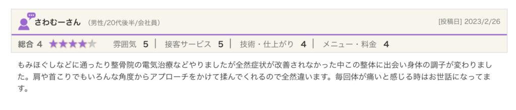 もみほぐしなどに通ったり整骨院の電気治療などやりましたが全然症状が改善されなかった中この整体に出会い身体の調子が変わりました。肩や首こりでもいろんな角度からアプローチをかけて揉んでくれるので全然違います。毎回体が痛いと感じる時はお世話になってます。
