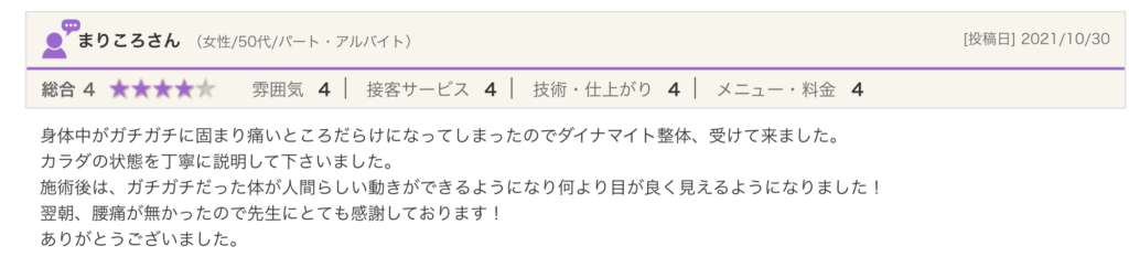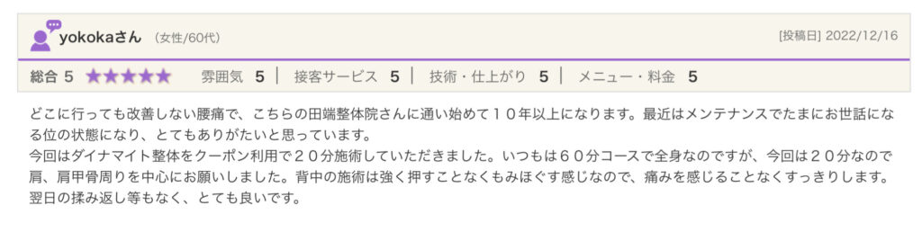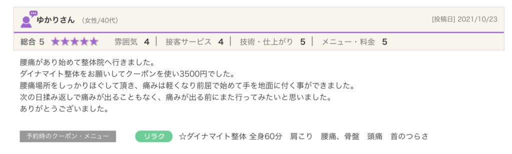 今回はダイナマイト整体をクーポン利用で20分施術していただきました。いつもは60分コースで全身なのですが、今回は20分なので肩、肩甲骨周りを中心にお願いしました。背中の施術は強く押すことなくもみほぐす感じなので、痛みを感じることなくすっきりします。翌日の揉み返し等もなく、とても良いです。