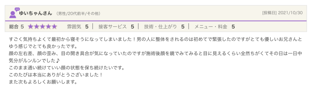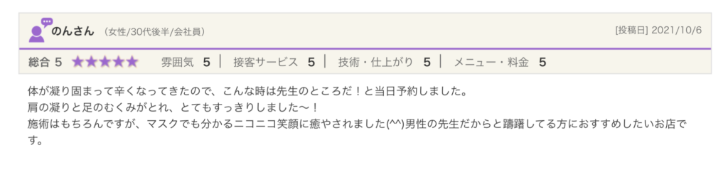 施術はもちろんですが、マスクでも分かるニコニコ笑顔に癒やされました(^^)男性の先生だからと躊躇してる方におすすめしたいお店です。