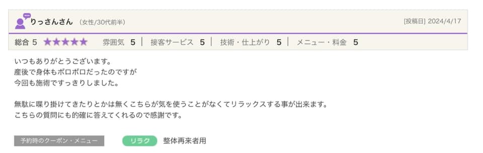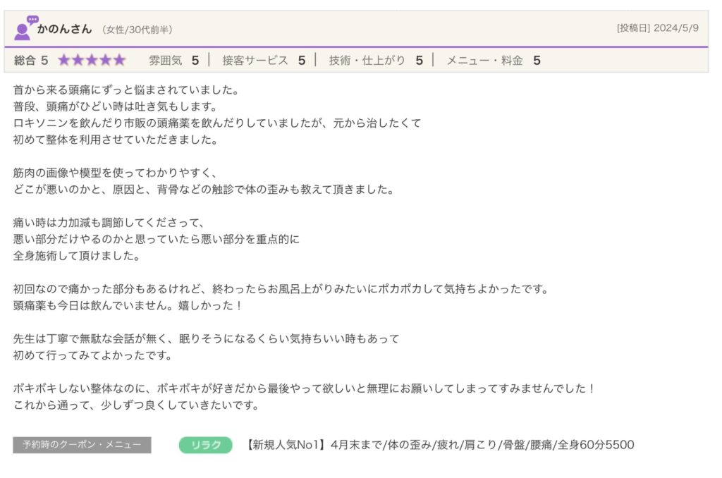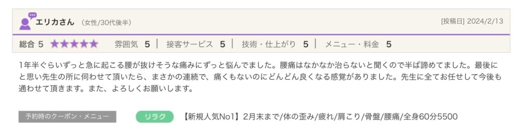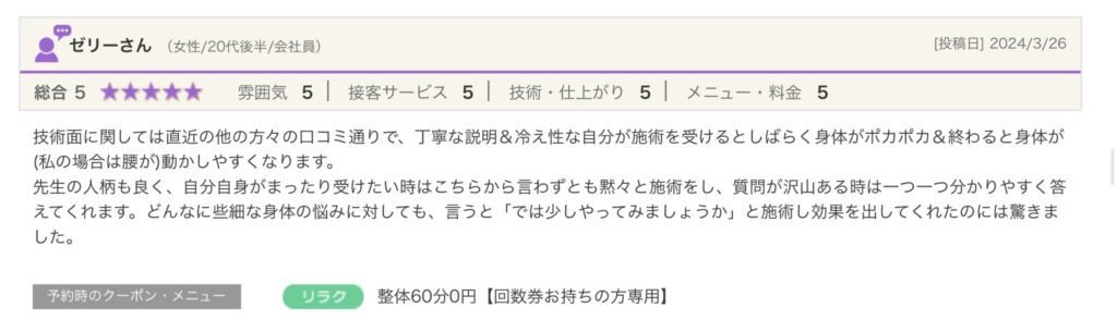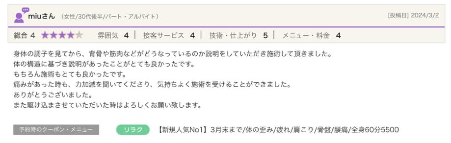 技術面に関しては直近の他の方々の口コミ通りで、丁寧な説明&冷え性な自分が施術を受けるとしばらく身体がポカポカ&終わると身体が(私の場合は腰が)動かしやすくなります。