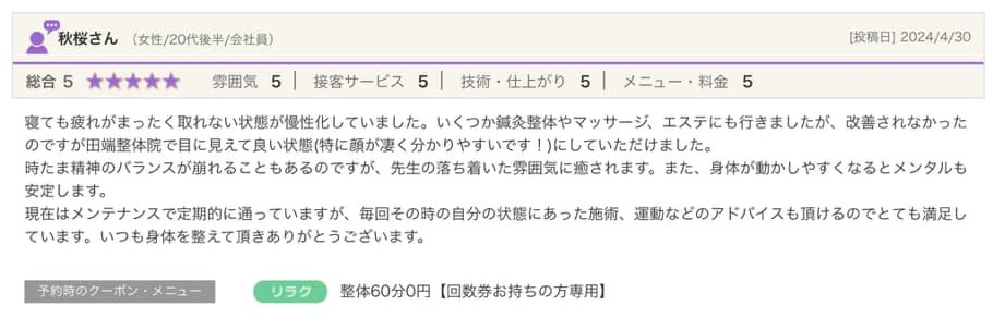 寝ても疲れがまったく取れない状態が慢性化していました。いくつか鍼灸整体やマッサージ、エステにも行きましたが、改善されなかったのですが田端整体院で目に見えて良い状態(特に顔が凄く分かりやすいです!)にしていただけました。