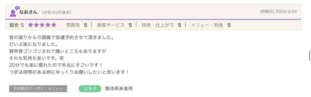 施術も気持ちよく、痛いところは痛く(強さの加減等しっかり確認してくださいました)、効いているなぁというかんじがしました。